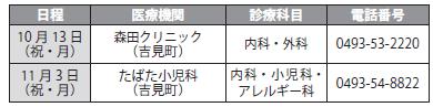くらし 10⽉・11⽉上旬の休⽇当番医 18/38 前の記事 次の記事 発行日 : 2025年10月01日 自治体名 : 埼玉県鳩山町 広報紙名 : 広報はとやま 令和7年10月号 ※診療時間 午前9時〜午後5時 Tweet シェアする 暮らしの情報Life Information[お知らせ](1) 休⽇夜間の急病相談、平⽇夜間のお⼦さんの急病・けがなど