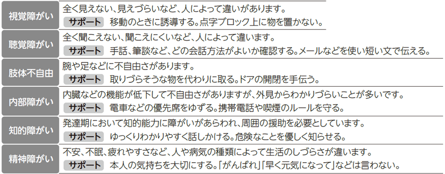 障がいには、さまざまな種類があり、その特性や困りごとには個人差があります。主な障がいとサポート例を紹介します。
