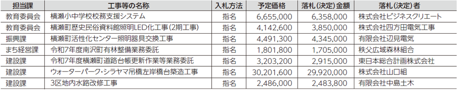 くらし 入札結果 32/42 前の記事 次の記事 発行日 : 2026年01月01日 自治体名 : 埼玉県横瀬町 広報紙名 : 広報よこぜ 令和8年1月号 (単位:円) ※予定価格および落札(決定)金額は税込みです。 ●開札日R7.11/7(金) ●開札日R7.11/21(金) Tweet シェアする よこぜ情報掲示板 お知らせ 1月 ごみカレンダー