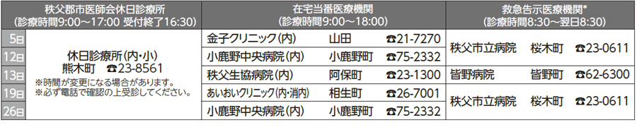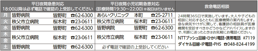 ※平日、休日の救急医療体制については秩父郡市医師会のホームページでもご確認いただけます。