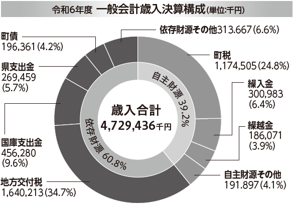 自主財源(町税などの町が自ら確保できる財源)は、主に寄附金や繰入金の増により、前年度と比べて62,330千円増額となりましたが、自主財源の占める割合は前年度に比べ1.3%減少し39.2%となりました。依存財源(国の補助金などの自主財源以外の財源)は、地方交付税の大幅な増や国・県支出金の増により、前年度と比べて239,852千円増額となり、依存財源の占める割合は前年度に比べ1.3%増加して60.8%となりました。