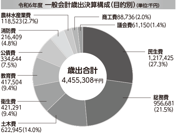 歳入総額は4,729,436千円、歳出総額は4,455,308千円で、前年度と比べると歳入302,183千円(6.8%)の増額、歳出214,126千円(5.0%)の増額となりました。