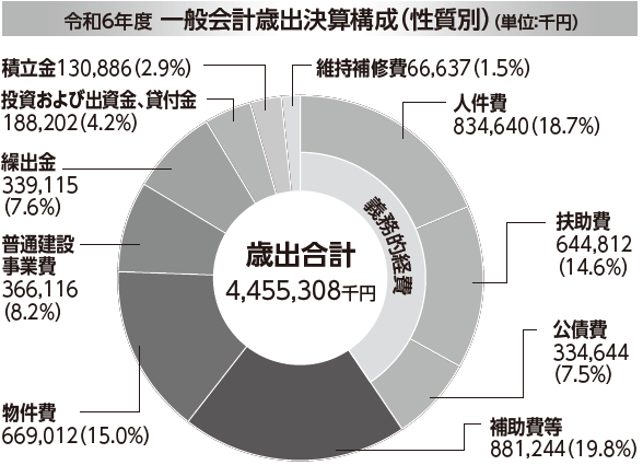 性質別では、公債費において既存借入の償還終了などに伴い元金償還金が減となった一方、人件費において給与改定に伴う各種手当が増、扶助費において障害福祉サービス費等負担金が増となったことなどにより、義務的経費が前年度に比べ236,497千円(15.0%)の増額となりました。投資的経費では、主に横小校舎整備事業における学校施設等整備工事、社会資本整備総合交付金町道整備事業における道路改良工事の減により44,070千円(10.7%)の減額となりました。