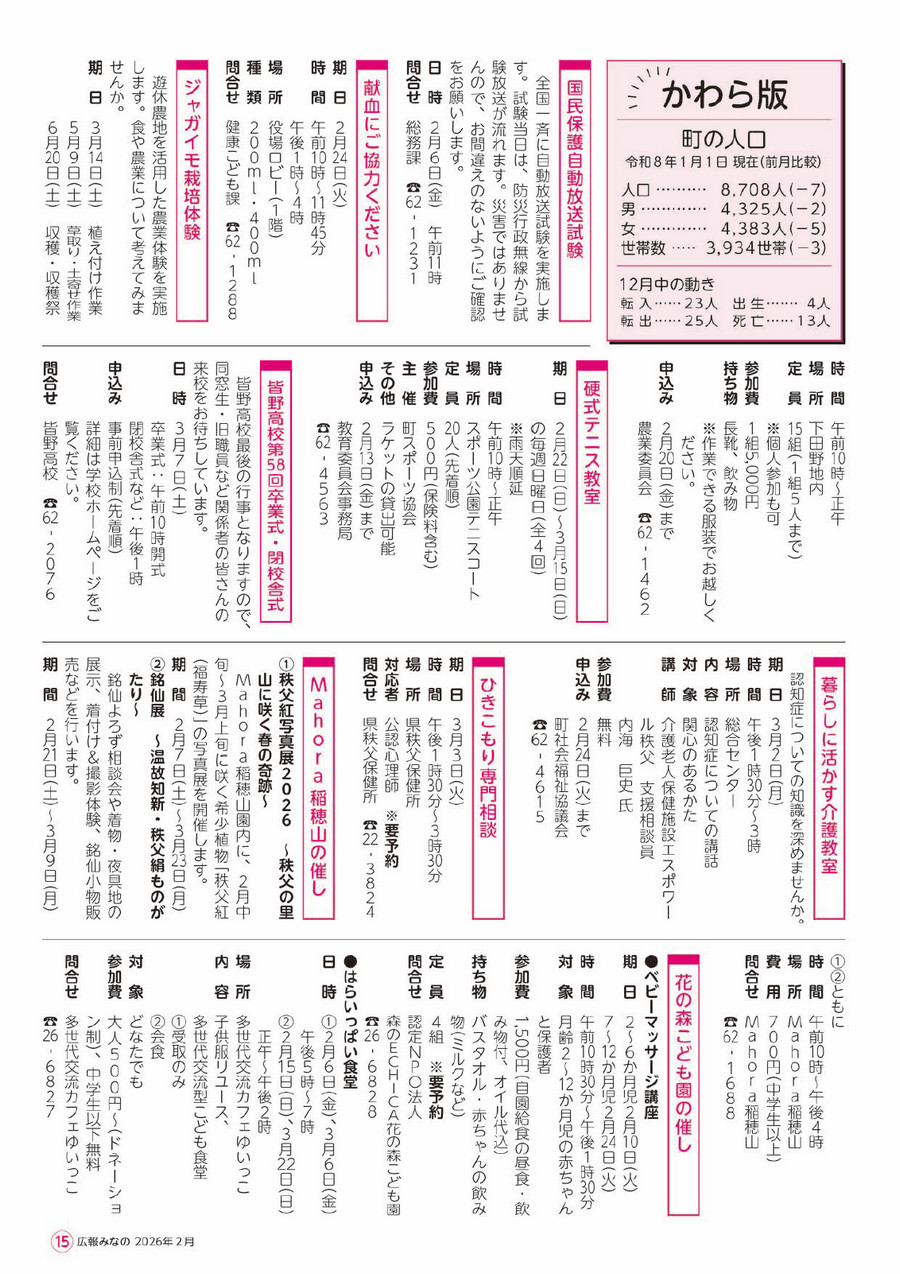 くらし 広報みなの 令和8年2月号 P.15 15/20 前の記事 次の記事 発行日 : 2026年02月01日 自治体名 : 埼玉県皆野町 広報紙名 : 広報みなの 令和8年2月号 Tweet シェアする 広報みなの 令和8年2月号 P.14 広報みなの 令和8年2月号 P.16
