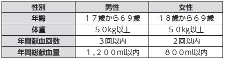 次の条件を満たしていて、血液比重、血圧測定、問診で健康と認められた方は献血ができます。(400mlの場合)