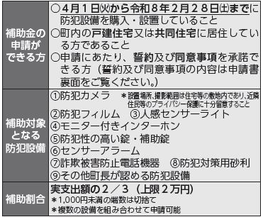 犯罪被害を未然に防止するため、町内の住宅等において防犯設備を購入・設置した方に対し、町が費用の一部を補助します。申請期限は令和8年3月13日(金)までですので、お早めの申請をお願いいたします。