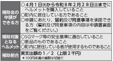 交通安全意識の高揚及び交通事故による被害の軽減を図るため、自転車用ヘルメットを購入した方に対し、町が費用の一部を補助します。申請期限は令和8年3月13日(金)までですので、お早めの申請をお願いいたします。