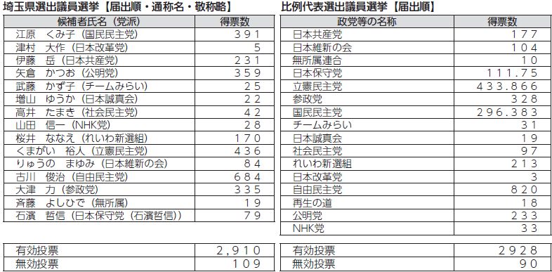 投票率は、埼玉県選出議員選挙及び比例代表選出議員選挙が53.57%でした。