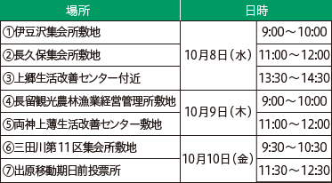 投票記載台と投票箱を車内に設置した車で次の7箇所を巡回します。各箇所1時間です。