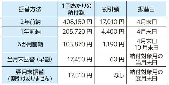 保険料を早割や前納で口座振替にすると、下表のように保険料が割引されます。
