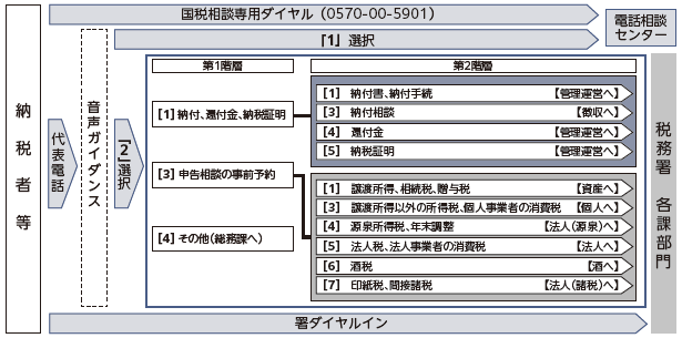 問い合わせ等の内容に応じて、担当部門に電話が直接つながるようにする取り組みを実施しています。なお、国税に関する相談は、国税庁ホームページ(チャットボット、タックスアンサー等)をご利用ください。また、職員に直接相談したい場合は、国税相談専用ダイヤル【電話】0570-00-5901へお問い合わせください。