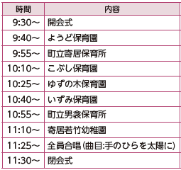 内容:町内の保育園(所)や幼稚園等の5歳児クラス(年長クラス)の児童が歌唱・演技の披露をします。