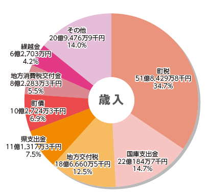 歳入は149億3,779万8千円で、前年度に比べて6億5,588万7千円(前年度比4.6%増)増加しました。