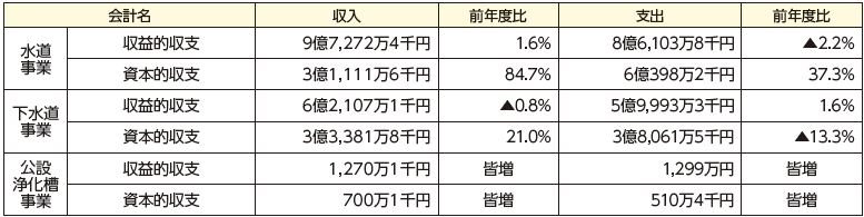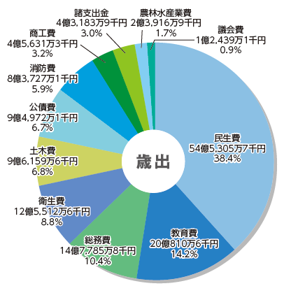 総務費は、庁舎維持管理事業の実施により、前年度比20.8%増の14億7,785万8千円となりました。消防費は、防災行政無線維持管理事業の実施により、前年度比48.9%増の8億3,727万1千円となりました。