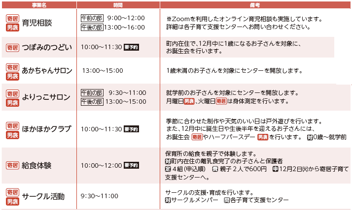 子育て支援センターとは、子育て家庭の親子を対象に、親子同士が交流でき、お子さんと遊べる施設です。寄居町立の子育て支援センターは、寄居保育所、男衾保育所内に併設され、保育士に子育ての相談をしたり、楽しいイベントに参加したりすることができます。
