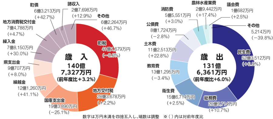 歳入は、前年度に比べ4億4,272万円の増額、総額は140億7,327万円となりました。町税が定額減税の実施により前年度と比べ減額となりましたが、地方交付税や各種交付金、地方債などの増額によって全体では前年度を上回りました。