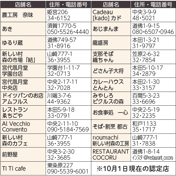 しごと 行政情報ハクモクレン20「宮代町地産地消推進の店をご紹介します」 21/58 前の記事 次の記事 発行日 : 2025年10月01日 自治体名 : 埼玉県宮代町 広報紙名 : 広報みやしろ 令和7年10月号 ■今年度の認定店 ・RESTAURANT COCORU ・お食事処 一心 問合せ:農業振興担当(2階14番窓口) 【電話】34・1111 内線266 Tweet シェアする 行政情報ハクモクレン19「西原自然の森フェスタ and 社協M1まつり」 行政情報ハクモクレン21「第29回 町民グラウンド・ゴルフ大会」
