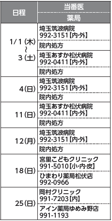 くらし 休日当番医・薬局/小児時間外診療 31/43 前の記事 次の記事 発行日 : 2026年01月01日 自治体名 : 埼玉県松伏町 広報紙名 : 広報まつぶし 令和8年1月号 ■休日当番医 受付時間:9:00~12:00 電話でご確認の上、受診してください。 ■小児時間外診療[初期救急] 受付時間:19:00~21:00 当日の担当医療機関は、町ホームページで確認できます。 事前に電話で患者さんの状態を伝えてから受診してください。 Tweet シェアする 無料相談 みんなでごみ減量