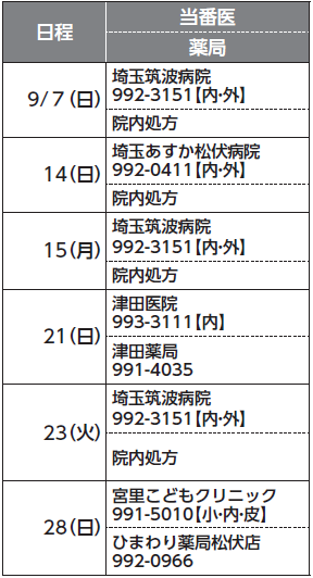くらし 休日当番医・薬局/小児時間外診療 35/49 前の記事 次の記事 発行日 : 2025年09月01日 自治体名 : 埼玉県松伏町 広報紙名 : 広報まつぶし 令和7年9月号 ■休日当番医 受付時間:9:00~12:00 電話でご確認の上、受診してください。 ■小児時間外診療[初期救急] 受付時間:19:00~21:00 当日の担当医療機関は、町ホームページで確認できます。 事前に電話で患者さんの状態を伝えてから受診してください。 Tweet シェアする 無料相談 みんなでごみ減量