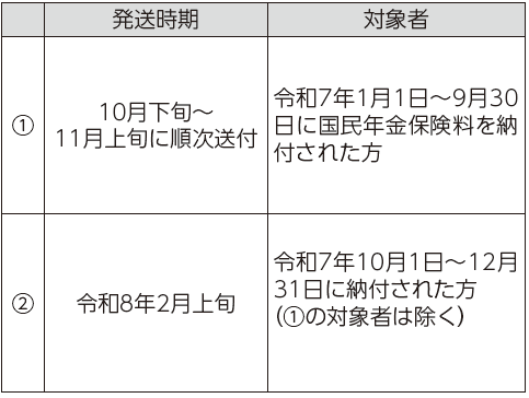 日本年金機構から、「社会保険料(国民年金保険料)控除証明書」が対象者宛てに送付されます。お手元に届きましたら、年末調整や確定申告の際に使用してください。