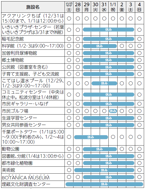 年末年始の市役所・区役所などの開庁日、主な施設の開館状況、応急診療を行っている医療機関などをお知らせします。