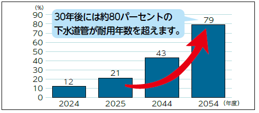 本市では、1992年の政令市移行をきっかけに普及促進に向け急ピッチで整備を行ってきました。その分、これから多くの下水道施設が老朽化していきます。改定を行わず、資金が不足すると、老朽化した下水道管の修理や地震対策などに必要な工事が進まなくなり、安全・安心な下水道サービスの提供に支障をきたす恐れがあります。