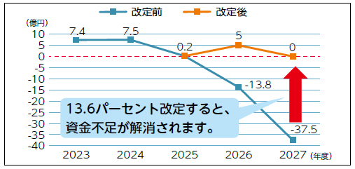 下のグラフのとおり、2027年度には、資金残高が約37億円不足する見通しで、この不足を解消するためには13.6パーセントの改定が必要となります。