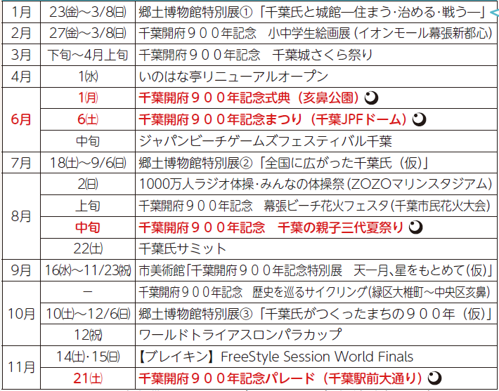 記念事業の詳細や900年のあゆみ、千葉市ゆかりの著名人からのメッセージがご覧いただけます。詳しくは、「千葉開府900年」で検索