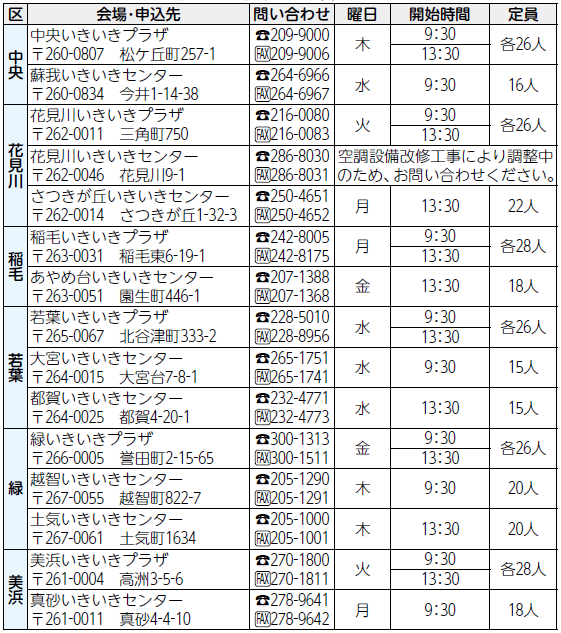 日時:4月または7月開始の2コース。いずれも3カ月間、全12回。曜日(第5週を除く)と開始時間は〔下表〕のとおり