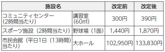 そこで、公共施設使用料等設定基準に基づいて、長期間見直しを行っていないコミュニティセンターやスポーツ施設、文化施設などの利用料金を、来年4月から改定します。