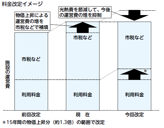 施設の料金は、現在、施設の運営費と利用料金との差を市税などで補っています。太陽光発電などの光熱費削減の取り組みで運営費の節減に努めますが、物価高騰下でも引き続き、施設を安定的に運営するためには、利用する方に適正に料金を負担していただくことが必要です。