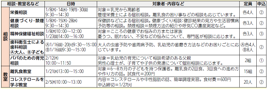 申込方法:1月5日(月曜日)9時から電話で、中央保健福祉センター健康課各班へ