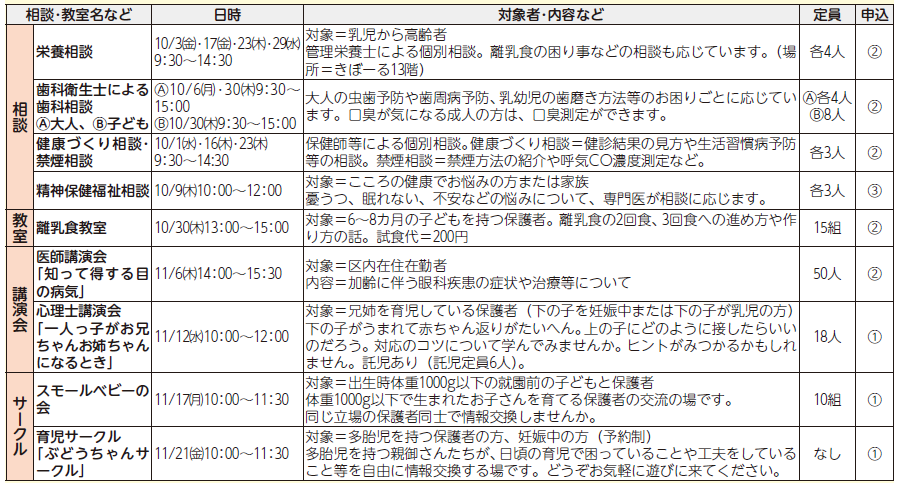 中央保健福祉センター健康課では、健康に関する相談や教室などを開催しています。参加する際は、体調を確認の上、お越しください。