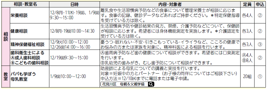 申込方法:12月1日(月曜日)9時から電話で、花見川保健福祉センター健康課各班へ