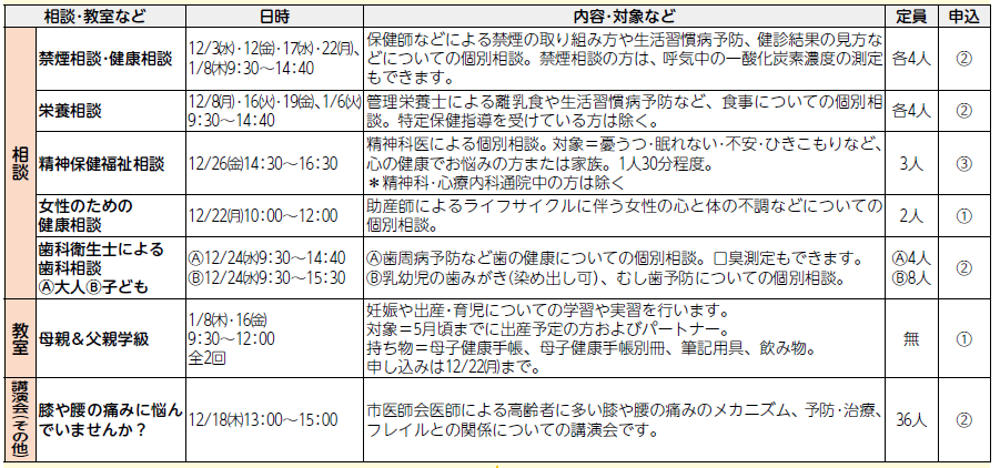 申込方法:12月1日(月曜日)9時から電話で、同センター健康課各班へ