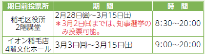 ・2月28日(金曜日)から3月2日(日曜日)までは知事選挙のみ投票可能です。