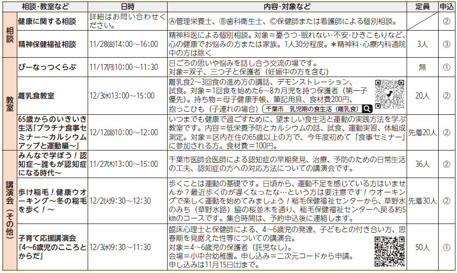 稲毛保健福祉センター健康課では、健康に関する相談や教室などを開催しています。