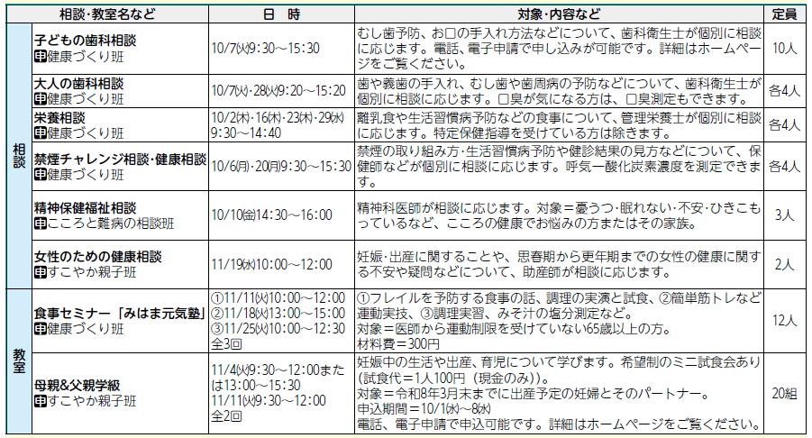 美浜保健福祉センター健康課では、健康に関する相談や教室などを開催しています。参加する際は、体調を確認しお越しください。
