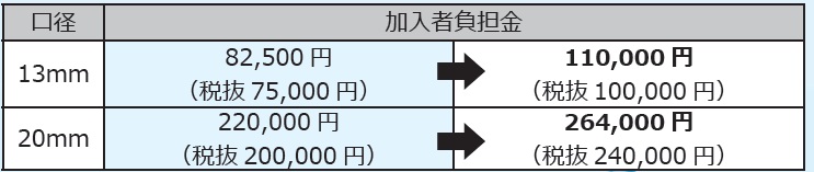 水道を新しく引いたり、給水管(水道メーター)の口径を大きくする等の場合は、需要者から工事費とは別に「加入者負担金」を徴収しています。