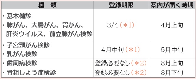 ・各種がん検診については、対象者のうち、年齢が20、25、30、35、40、45、50、55、60、65歳の方