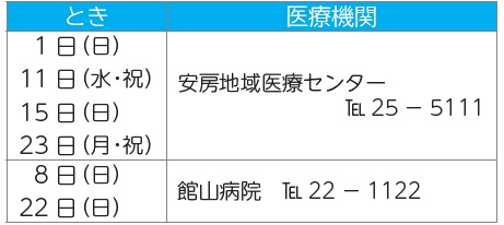 くらし 休日の救急医療機関[2月] 34/39 前の記事 次の記事 発行日 : 2026年01月20日 自治体名 : 千葉県館山市 広報紙名 : 広報だん暖たてやま 令和八年2月号 安房地域医療センターは、毎日24時間体制で救急患者を受け入れています。 救急受診: 1.事前に電話連絡【電話】25-5111 2.WEB問診(WEB予約ではありません) Tweet シェアする 人口・世帯数 館山市公式Instagramをフォローして、観光・食・イベント情報をキャッチ!