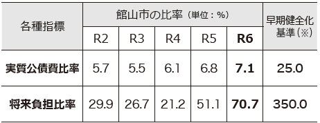 「健全化判断比率」や「資金不足比率」などの法令に基づく基準値を下回っていますが、近年数値が悪化しています。
