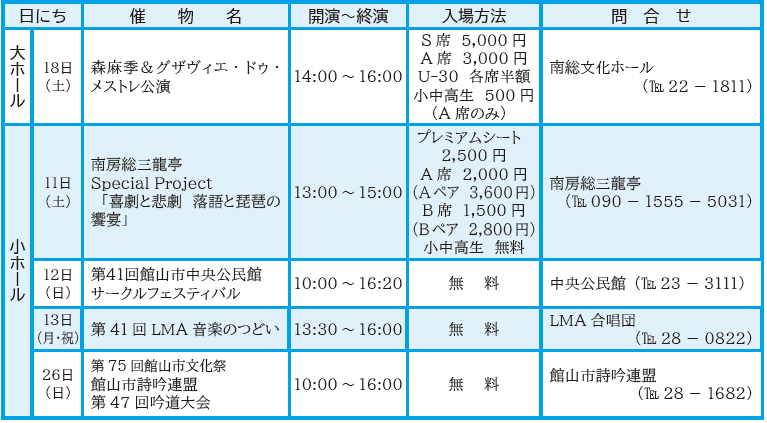 文化 南総文化ホール 31/42 前の記事 次の記事 発行日 : 2025年09月20日 自治体名 : 千葉県館山市 広報紙名 : 広報だん暖たてやま 令和七年10月号 10月の休館日:6日、14日、20日、27日 9月3日現在の申込み分の中より掲載 問合せ:南総文化ホール 【電話】22-1811【HP】https://www.cbs.or.jp/nanso/ Tweet シェアする 乳幼児健診・相談【予約制】 図書館だより 231