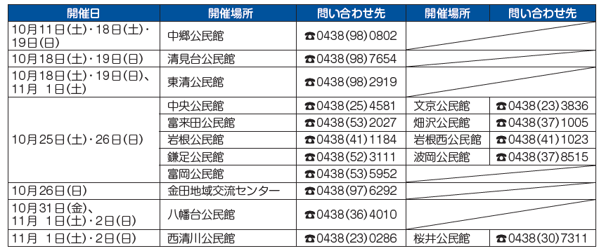 市内各公民館・金田地域交流センターでは、地域の団体・サークル活動の成果として絵画などの作品展示・合唱・ダンスなどの芸能発表が行われ、呈茶会(ていちゃかいや)模擬店なども出店します。