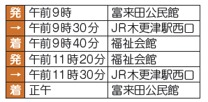 当日は富来田公民館、JR木更津駅西口(みなと口)を経由した送迎車を運行します。利用希望の方は、10月10日(金)までにご連絡ください。