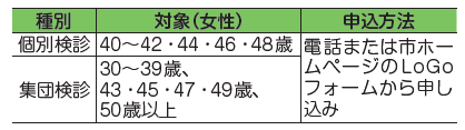 胃がん・結核肺がん・大腸がん・子宮頸がん検診について、予約方法や空き状況は市ホームページのLoGoフォーム(本紙の二次元コード参照)または電話でご確認ください。