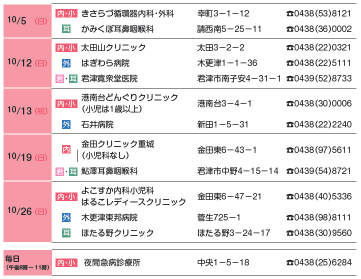 ・診療科目が決まっています。また、やむを得ない事情により変更する場合もありますので、受診前に病(医)院へ電話で確認してください。変更後の病(医)院や場所が分からない場合は、消防本部【電話】0438-22-0119へお問い合わせください。