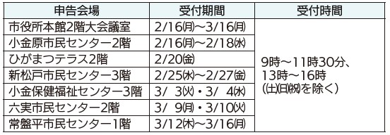 下記会場では市民税・県民税の申告・相談・作成のみ行います。所得税の確定申告書の相談・作成は、松戸税務署(【電話】047-363-1171)の申告会場で行ってください。