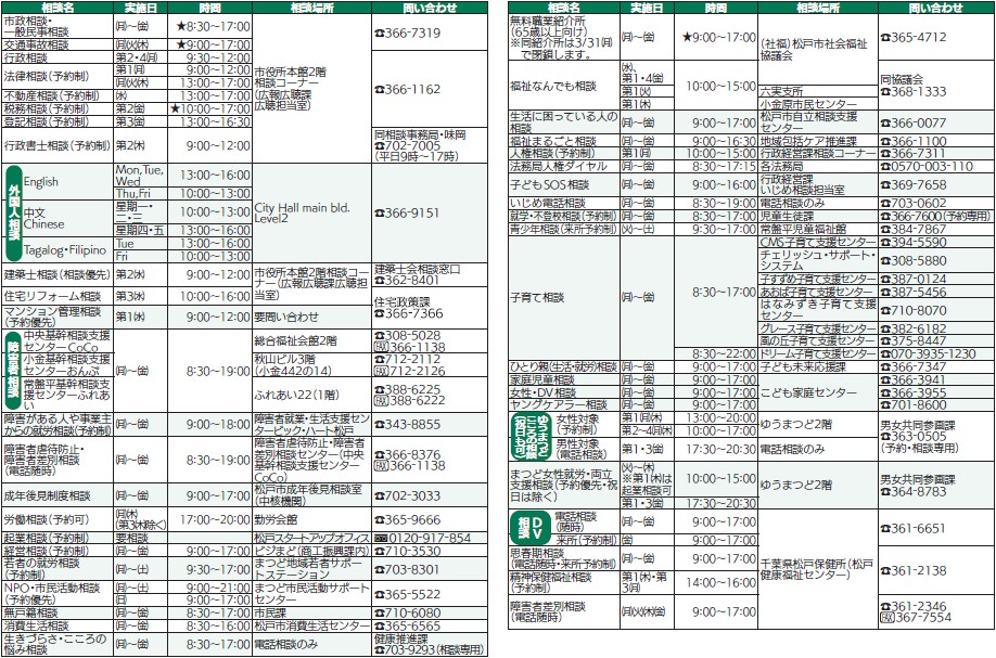 ※相談は全て無料です。各施設閉庁日は相談できません。