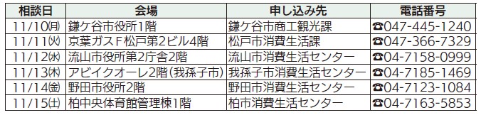 申込み:11月4日(火)から、電話で各申し込み先へ(野田市のみ11月5日(水)から)